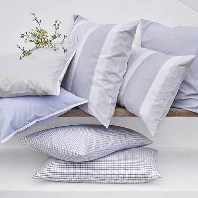 Schlossberg's Riga Gris. Fine pinstripes form the broad, gray-beige block stripes. The exceptionally coordinated color scheme lends the brightly colored RIGA poplin linens their timeless aesthetic.
