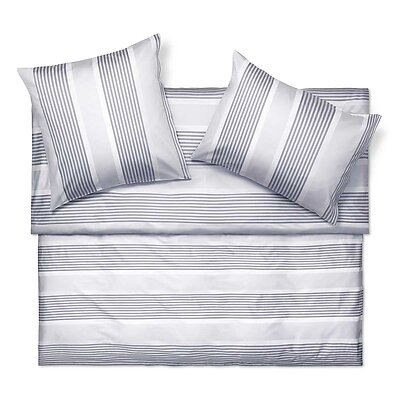Schlossberg's Spencer Gris. Clear horizontal block stripes adorn the colorful woven SPENCER bed linen. With this timeless design, the alternating wide and fine stripes create a varied look. Available in two masculine colors, blue and gray.