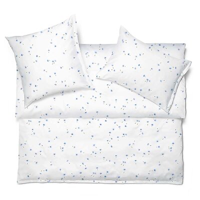 Schlossberg's Suki Blanc features fine seed parachutes whirl through the air cheerfully. Clad in finest blue-green, they flit here and there, embarking on a lively journey. The delicate parachutes, finely drawn with colored pencil and watercolor, land playfully, as if by chance, on the white background of the satin bed linen.