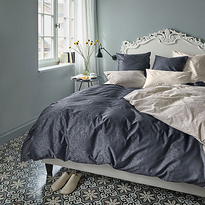 Schlossberg's Talis Bleu features an elegant paisley pattern in a jacquard that creates a sublime play of colors with a matte-gloss effect, showing the pattern to best effect.