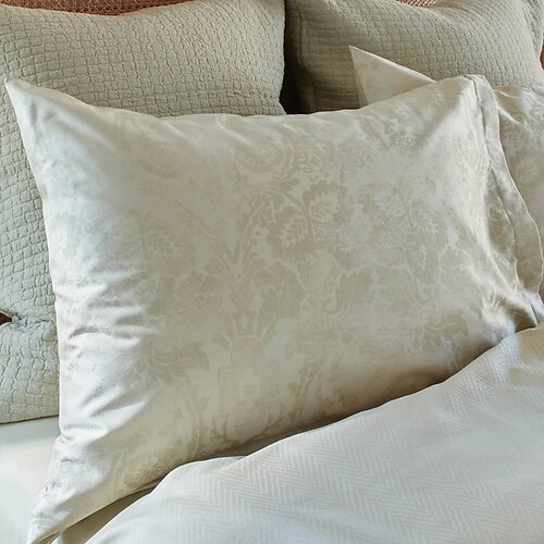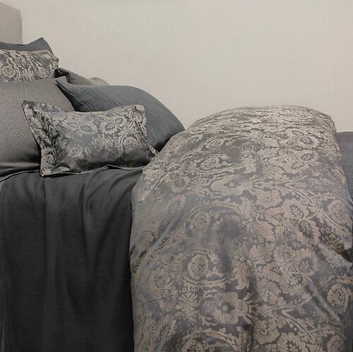 Featuring a baroque floral design in soft and lightweight cotton, this fine jacquard weave is a great foundation pattern. 1st Image: Baton Rouge Raisin standard pillowcases and duvet cover with Malta Raisin coverlet and large decorative pillows. 2nd Image: Baton Rouge Nilo standard shams shown with Aden Nilo top sheet and Piani Nilo Euro decorative pillows.