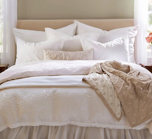 The SDH Hibiscus collection reimagines a timeless floral motif through a minimalist lens, blending natural elegance with contemporary ease. Woven in Italy from a luminous mix of 60% linen and 40% silk, this yarn-dyed jacquard boutis design features a soft hibiscus pattern that feels both grounded and ethereal. The delicate tone of Snow (light cream) adds a whisper of color while keeping your space serene and inviting. Every element of this collection-duvet covers, coverlets, throw blankets, bed shams, and decorative pillows-was made to soften your room with nature's effortless beauty. Shown here as a Duvet Cover and Euro decorative pillow with Sumi Snow coverlet, Tayla Snow standard pillowcases and sheets, Anna Ecru boudoir sham.