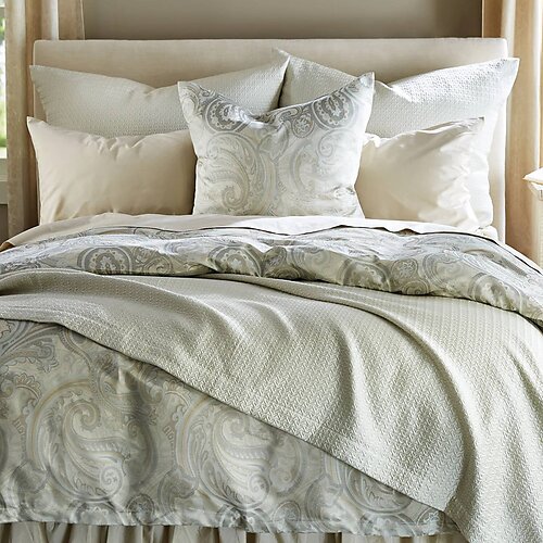 Meet SDH Taifun, where intricate artistry meets modern refinement. Crafted from a luxurious blend of 65% Egyptian cotton and 35% silk, this stunning collection of duvet covers, coverlets, throw blankets, shams, and decorative pillows features a dynamic six-color yarn-dyed jacquard that swirls into an elegant, updated paisley pattern. Woven in Italy in the rich, moody Green Bottleglass hue, Taifun brings elevated drama and tactile sophistication to any bedroom. It's bold. It's breathable. And it's made to be lived in. Shown here as a duvet cover and euro decorative pillow with Kimi Silk Bottleglass coverlet and large decorative pillows and Julia cream sheets and pillowcases.