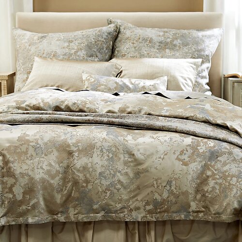 Step into the refined world of SDH Trava, a luxurious bedding collection that feels like sleeping inside a work of art. Woven from a serene blend of 45% silk and 55% Egyptian cotton, Trava features a free-form abstract motif reminiscent of weathered stone, patinaed metal, or painterly landscapes. The soft interplay of muted hues-steel gray, taupe, and champagne-creates a sophisticated surface with fluid depth and quiet elegance. Whether viewed up close or across the room, Trava transforms with the light, revealing subtle shimmer and organic movement that makes your bed the focal point of your space. Shown here with SDH's Sheba Steel coverlet and large decorative pillows, Senne Tea standard pillows and Senna Steel top sheet.