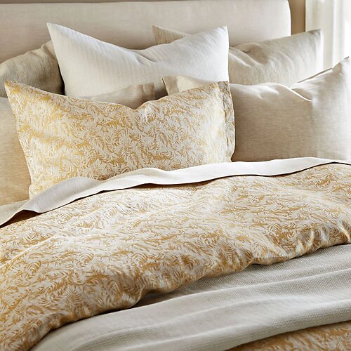 Let nature drape your bedroom in luxury. The SDH York Collection is crafted from 100% linen and woven in Italy using a 2-color yarn-dyed jacquard technique that brings out a stylized botanical motif reminiscent of layered ferns and palm fronds. The intricate pattern is both refined and free-spirited-full of graceful motion and depth. Available in earthy tones like Dijon, Cadet, Rye, and Dove, this design feels like a breath of fresh air, ideal for anyone who loves a room that feels grounded yet elevated.