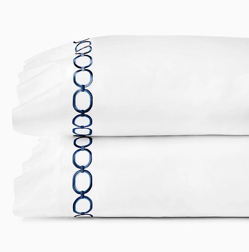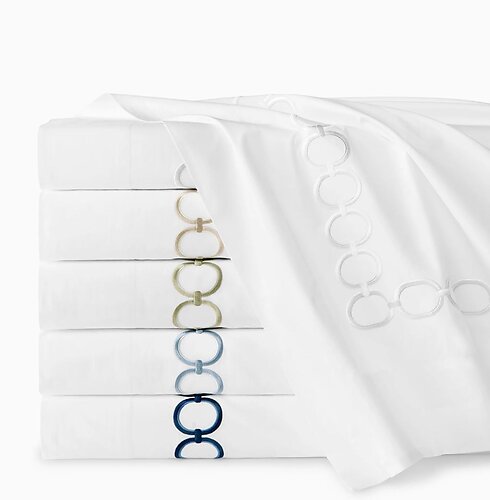 Sferra Catena Sheets and Bedding available in the following colors: White with Navy Blue, Lunar, Sand, Sea Blue, Willow Green