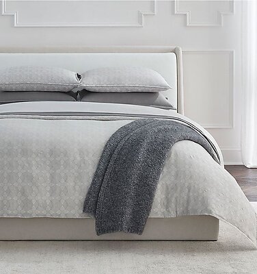 A Tapestry of Opulence: Dive into luxury with Sferra's Ferentino Bedding Collection. Crafted in Italy, this collection boasts graphic rigor and opulence, featuring a full-coverage geometric pattern in titanium and white threads.