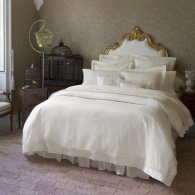 Shown in main image: Sferra Giza 45 Lace duvet cover, shams, flat sheet and pillowcases, Sferra Giza 45 Percale fitted sheet, Sferra Savoy blanket, Sferra Celeste bed skirt.