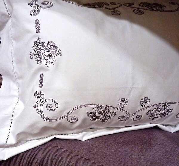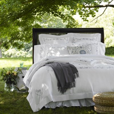 Sferra Janella is an exquisite linen collection crafted from 100% Egyptian cotton percale, celebrated for its soft, airy feel and timeless elegance. White cotton is gracefully adorned with delicate floral embroidery and ribbon-like scrollwork in wisteria purple, Janella evokes a romantic, ethereal charm. This set was used on a display bed and is in excellent condition. The bedding set consist of 1x Full / Queen Duvet Cover, 2x Standard Shams, 2x Euro Shams.