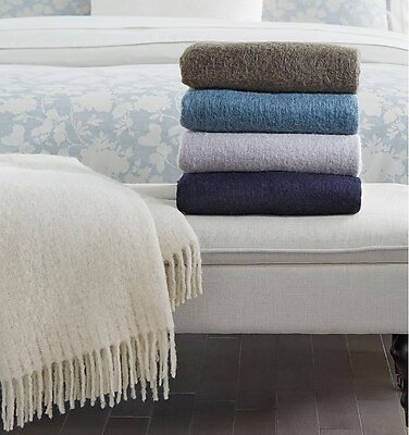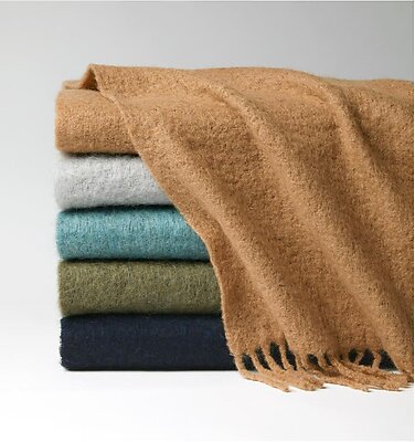 A downy, Alpaca-blend throw woven into a bouclé texture lends a cozy and tranquil feel.