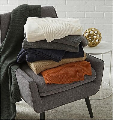 - Yarn-dyed knit, ribbed border on throws, pillows are knife-edge and have a feather down filler