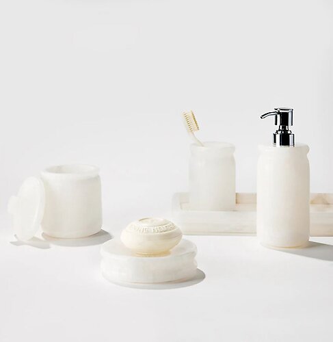 More than just beautiful, the Volterra Collection is thoughtfully designed to bring style and purpose together. The soap pump and dish offer graceful convenience, while the tissue box and wastebasket deliver seamless integration into any design scheme. The tray and storage jar are perfect for keeping essentials within reach, while the toothbrush holder adds a refined touch to your countertop. These alabaster accessories strike the perfect balance of form and function, making them ideal for both minimalist and luxurious interiors.