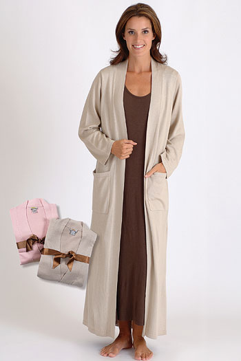 The softness and warmth of this silk & cashmere robe make it irresistible. Some of us just can't leave it at home,so we have been wearing it as a sophisticated long sweater. Looks fabulous and is so comfy.