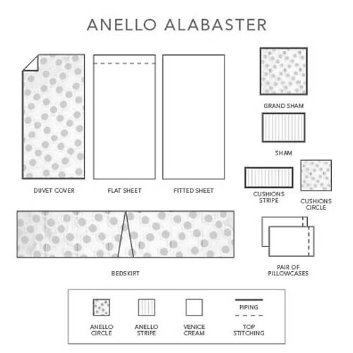 Transform your bedroom into a sanctuary of soft elegance with the Anello Alabaster Bedding Collection. Expertly woven from 71% long-staple cotton and 28% silk, this luxury jacquard bedding brings a luminous touch to your space. The delicate circle patterns and complementary raised stripes add a beautiful texture, creating an inviting and timeless retreat that feels as incredible as it looks. Special order, usually ships in 4-6 weeks. Can be customized. See Venice Cream or Capri Cream for coordinating sheets, pillowcases and bedskirts.