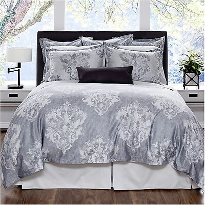 Madelaine, our bold medallion fabric, was designed exclusively for St Genève in Europe and woven in Italy with 100% long staple cotton. The fabric is fully reversible from a dark side to a light side, the Madelaine comes in a graphite palette, which can be layered using both colorways for dramatic effect.