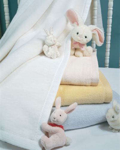 St. Moritz Baby Blankets by Sferra As soft as a baby's skin and even plusher than the downy peach fuzz on their cheeks, this snuggly brushed cotton crib blanket is the kind of blanket they may never want to give up. 30x40" In pure long-staple brushed cotton finished with a ribbed twill border, made in Portugal. This classic style also available in regular St. Moritz Twin, Full/Queen and King Blankets. Can be Monogrammed, usually adds 4-6 weeks. Monogramming is in script type characters.
