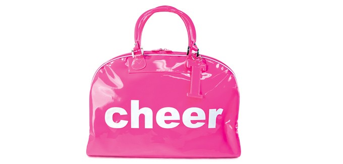One fuchsia patent PVC bag with "cheer" on front of bag. Bottom interior of large bag is silk-screened with "go! fight! win!! (12"h x 18"w x 7"d)