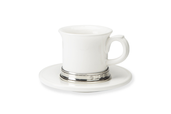 Item 1532.0. Set of 2 Cups and Saucers, 2.5" diameter x 2.6" high. Match Pewter is handmade by artisans in the