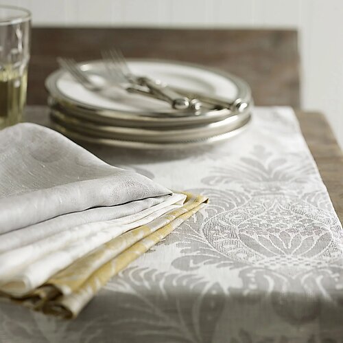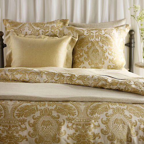 SDH Dorset linen jacquard fabric features an intricate old-world pattern that will add a beautiful look to your bedroom or table. Shown here as a duvet cover and Euro pillows with Canterbury Dijon standard sham and Camden Dijon coverlet.